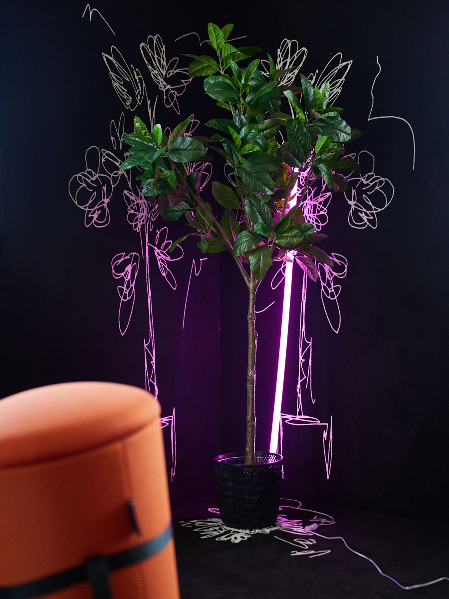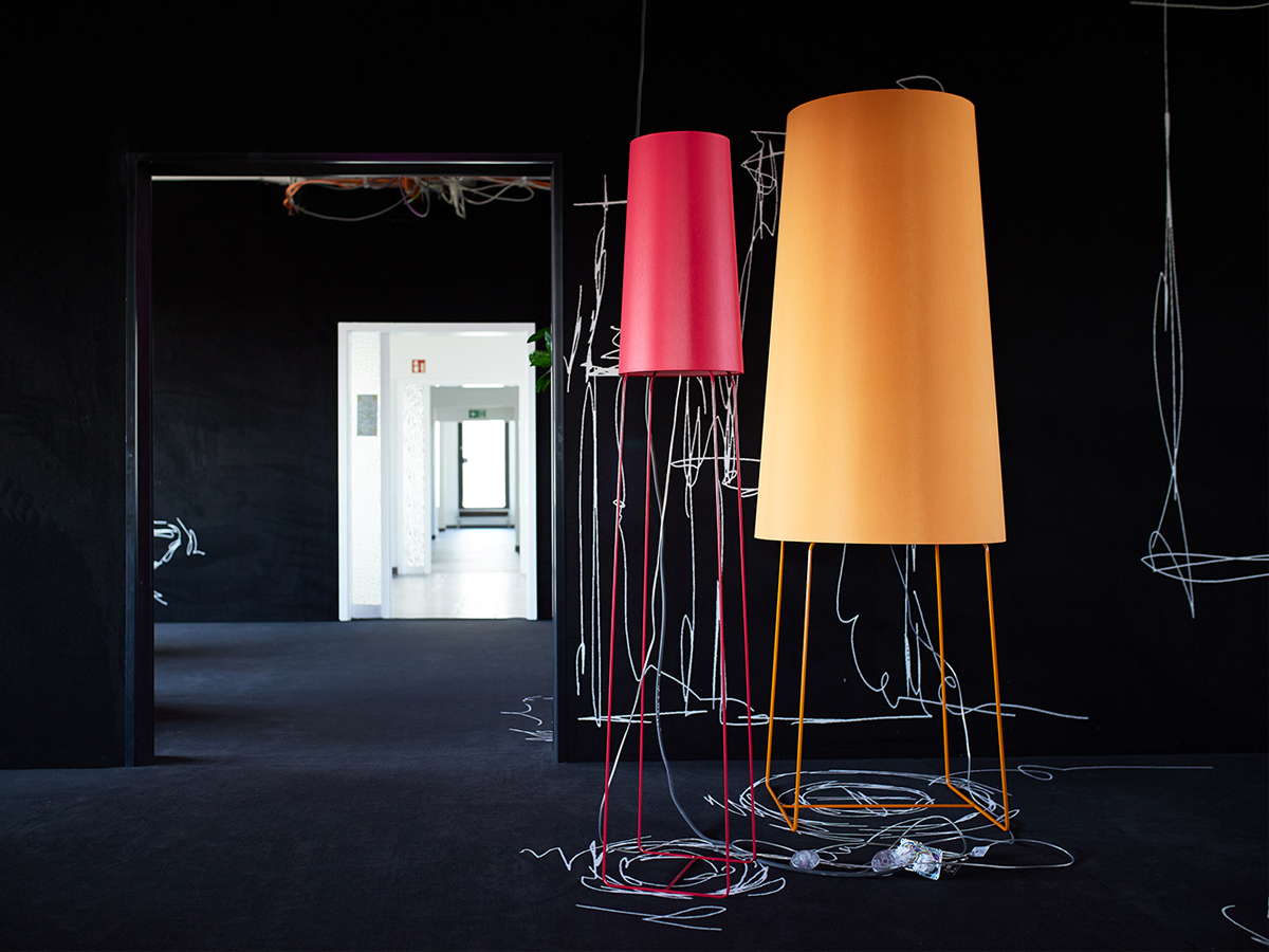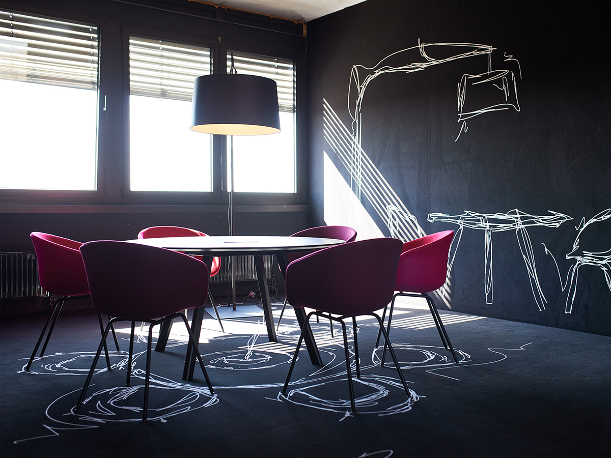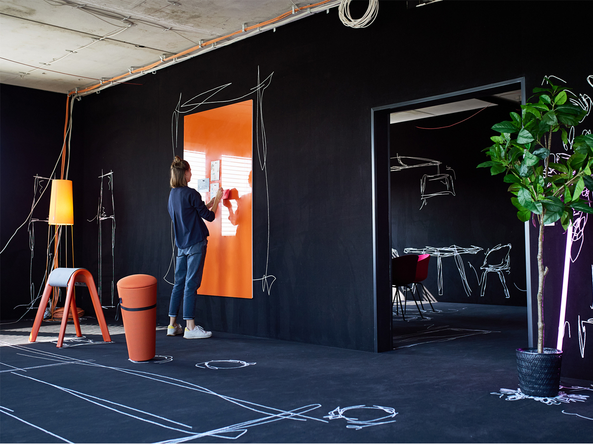 Diese Arbeitsumgebung zeigt einen experimentellen Raum, in dem Möblierung, Licht und skizzenhafte Illustrationen zu einem kreativen Gesamtkonzept verschmelzen. Die schwarzen Wände und Böden, die mit Teppich verkleidet sind, dienen als Bühne für weiße Linienzeichnungen, die räumliche Strukturen und Möblierung spielerisch andeuten. Farbige Designobjekte setzen gezielt Akzente und schaffen flexible Nutzungsszenarien. Durch bewusst sichtbare Installationen und offene Decken entsteht ein unfertiger Charakter, der zum Ausprobieren einlädt. Das Musterbüro fungiert damit als inspirierende Testfläche für moderne Arbeitswelten.