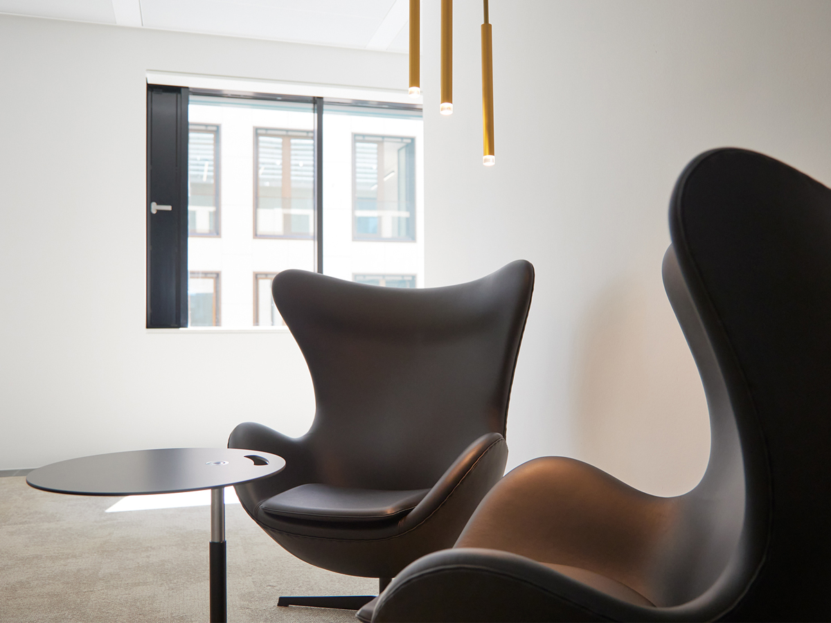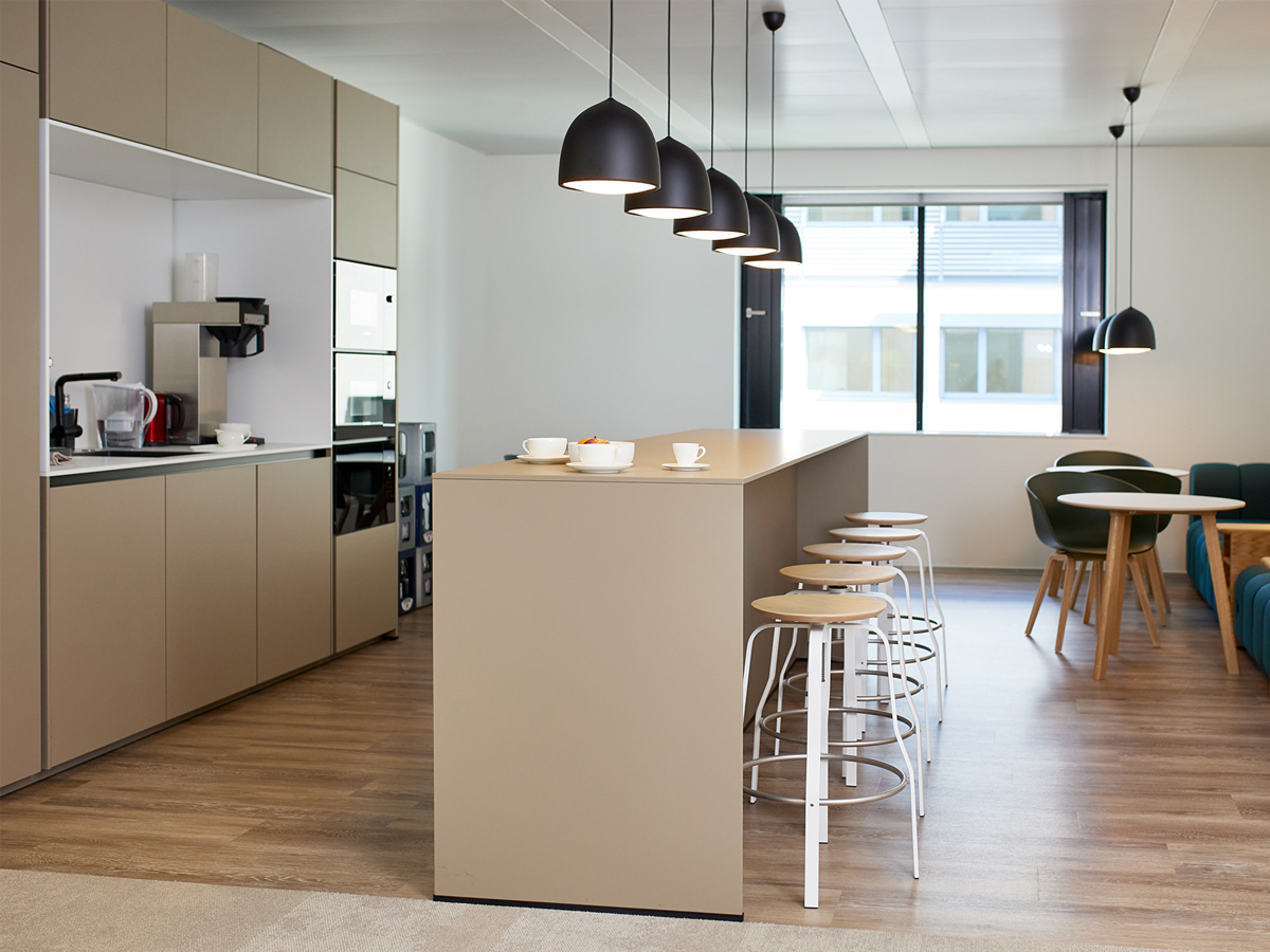 Offene Arbeitsplätze, elegante Konferenzräume und eine einladende Empfangszone schaffen eine professionelle und zugleich angenehme Arbeitsatmosphäre. Warme Akzente, hochwertige Möblierung und ein abgestimmtes Beleuchtungskonzept unterstützen diese und fördern das Wohlbefinden. Ergänzend bietet die großzügige Mitarbeiterlounge Raum für Austausch, Pausen und informelle Zusammenarbeit.